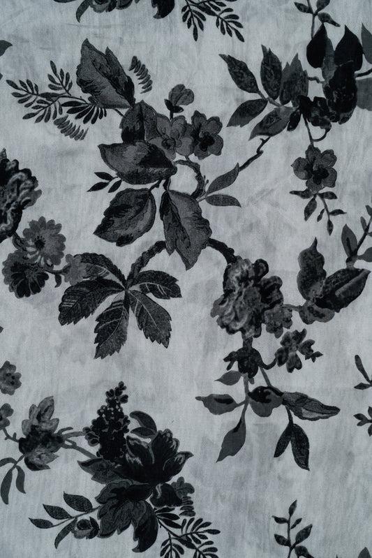 Light Grey & Black Floral Printed Pure Muslin Fabric (Width 44 Inches)