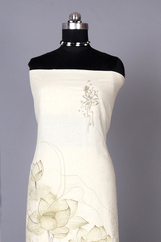 Lime Green Lotus Printed Pure Linen Unstitched Suit Set