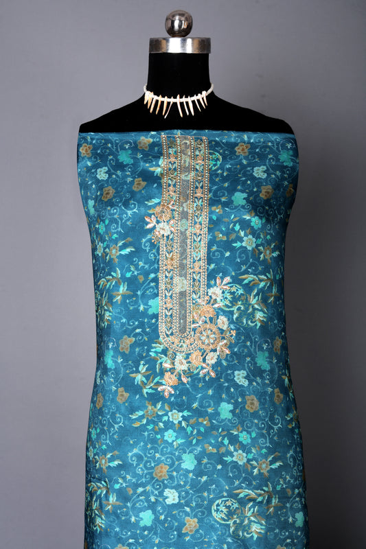 Pista Green Color Floral Embroidered Pure Muslin Unstitched Suit Set