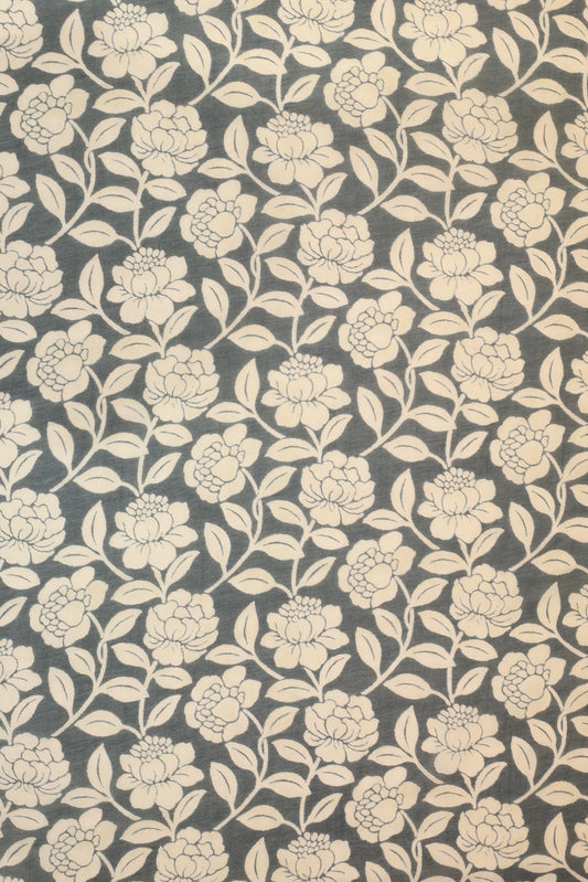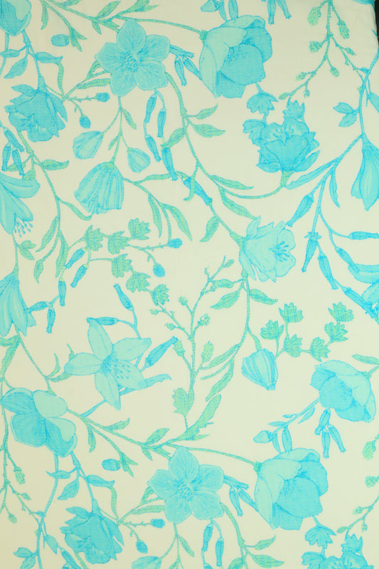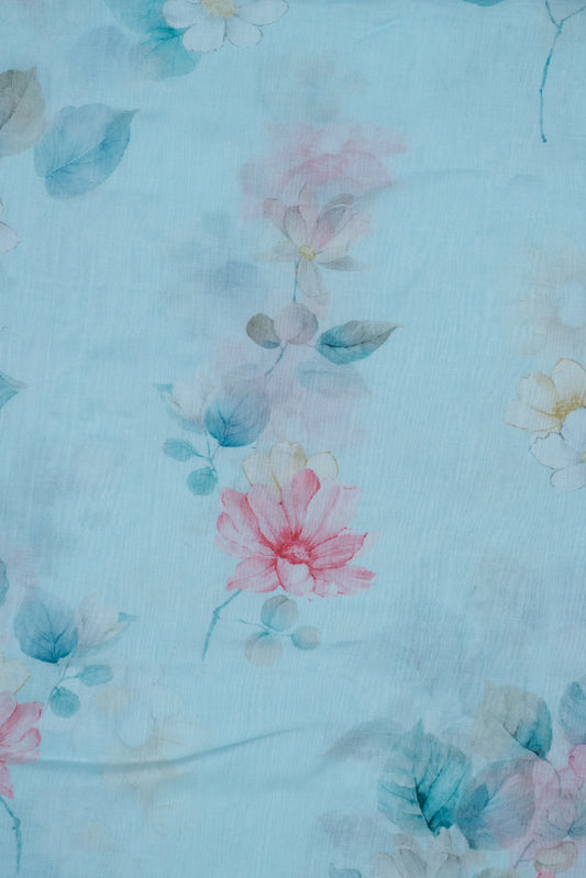 Ethereal Blue Floral Elegance Printed Pure Malai Chanderi fabric (Width 44 Inches)