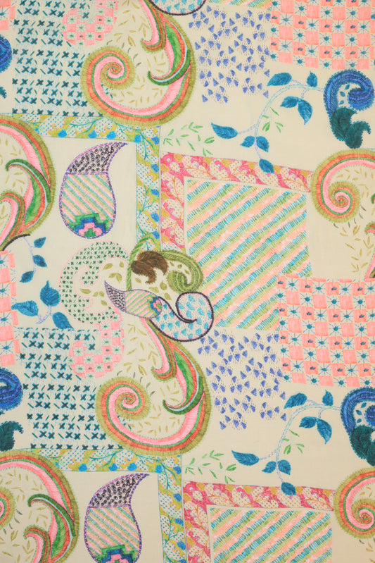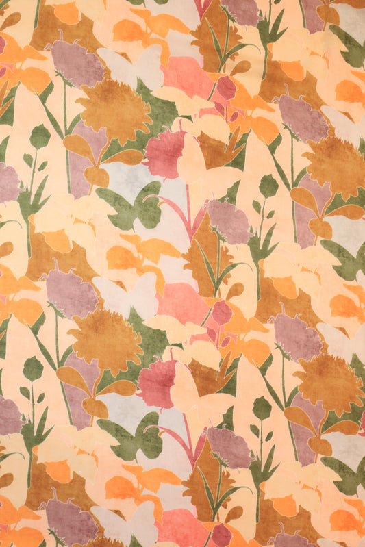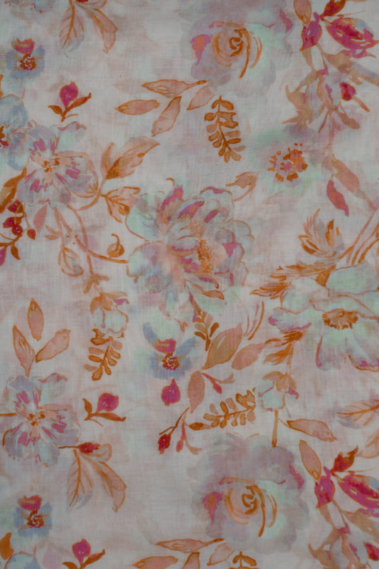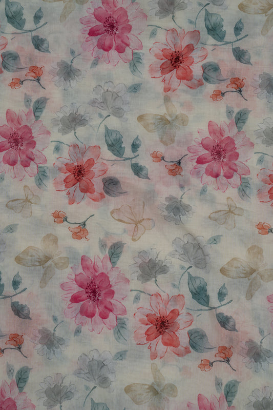 Cream & Pink Flower Garden Digital Printed Pure Malai Chanderi Fabric (Width 44 Inches)