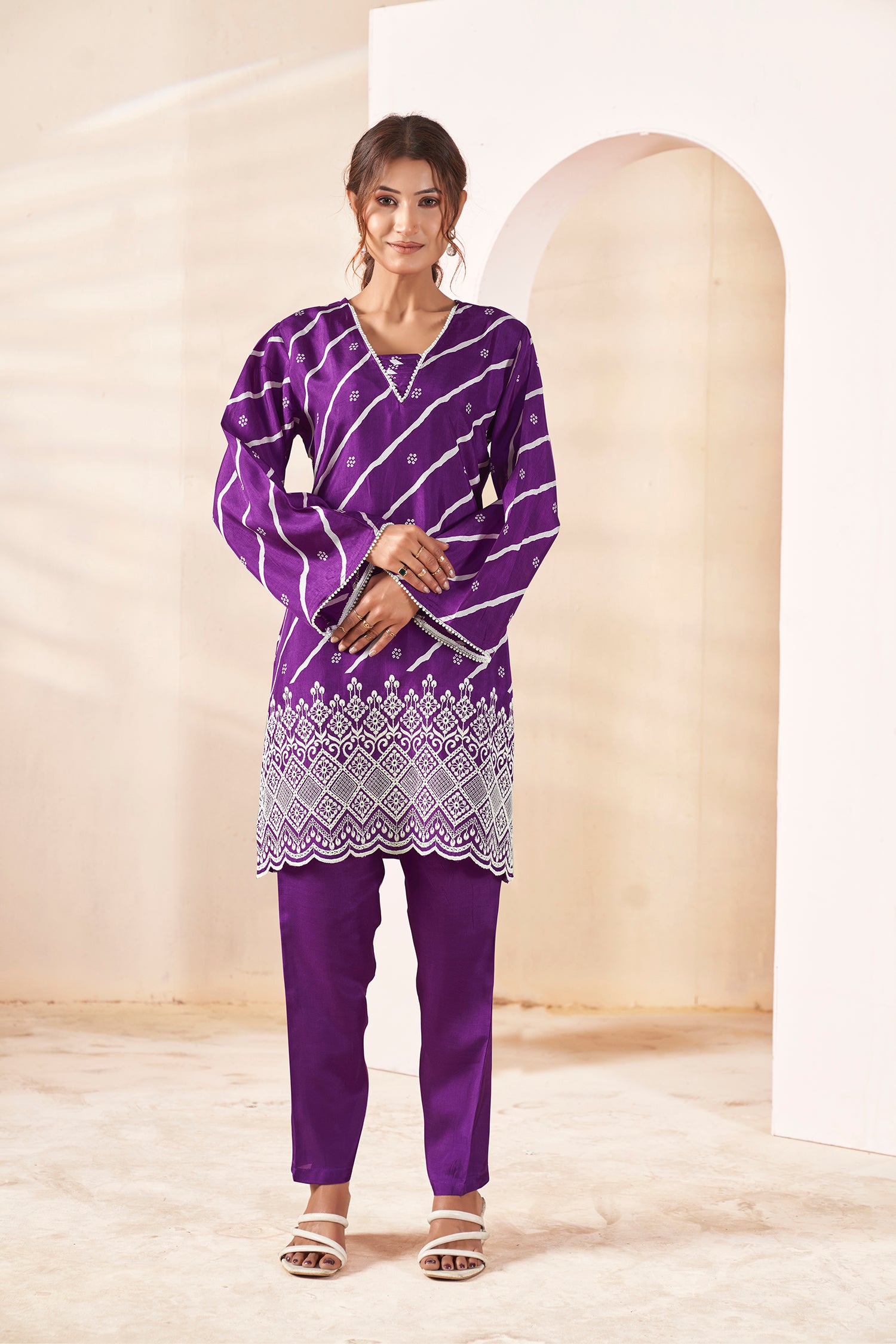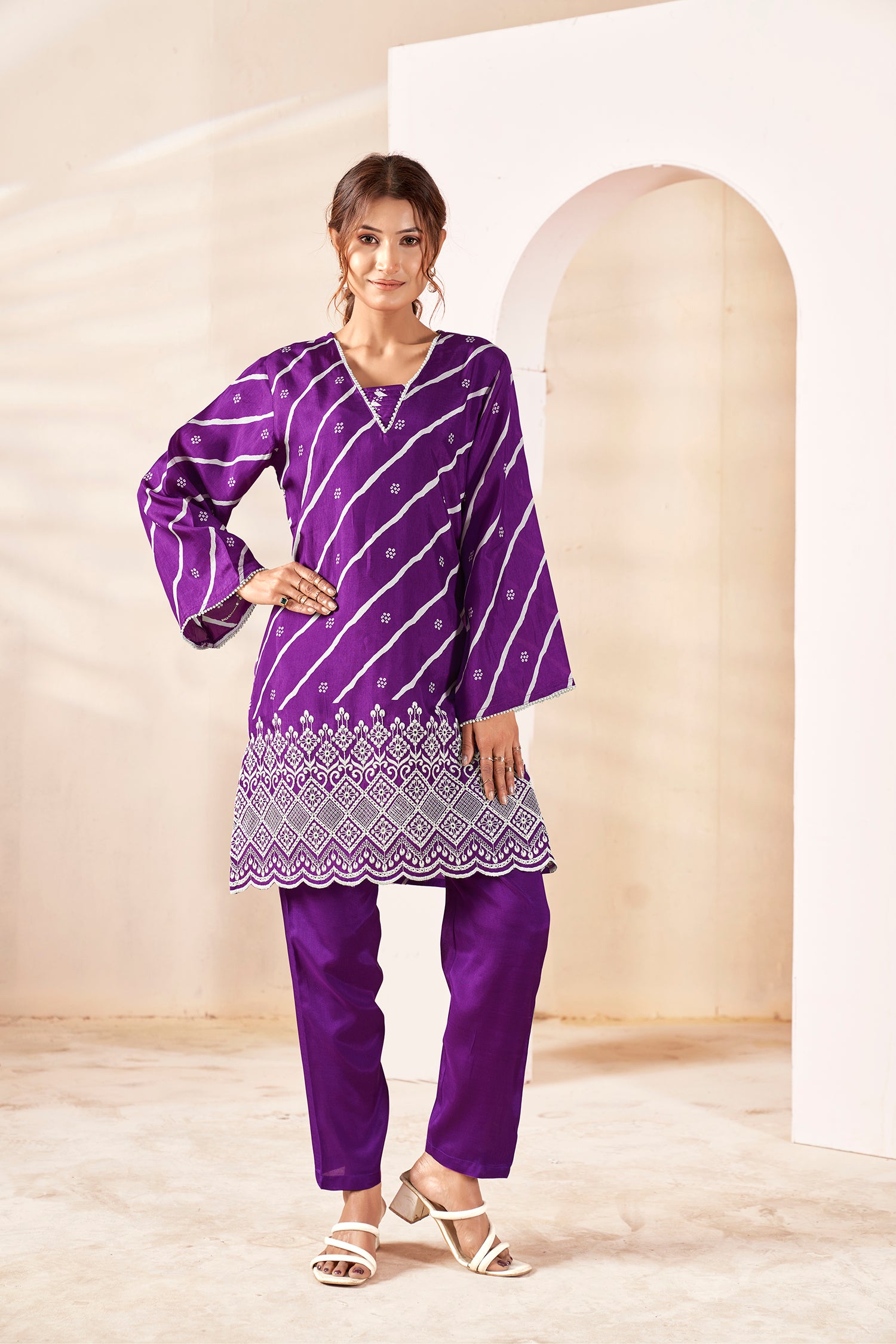 Celebrate tradition with a modern twist in this stunning purple cord-set, crafted from luxurious Russian Silk that offers a soft sheen and an elegant drape. This ensemble showcases a vibrant fusion of traditional diagonal Leheria stripes and intricate Bandhani motifs across the kurta. Designed with a sophisticated V-neckline and dramatic bell sleeves, the outfit is elevated by delicate pearl work tracing the neck and sleeve ends and an intricate white thread-work scalloped hemline. Paired with matching solid purple straight-cut pants, this look is a quintessential choice for festive galas, Mehendi ceremonies, or ethnic workdays where you want to stand out with effortless grace.