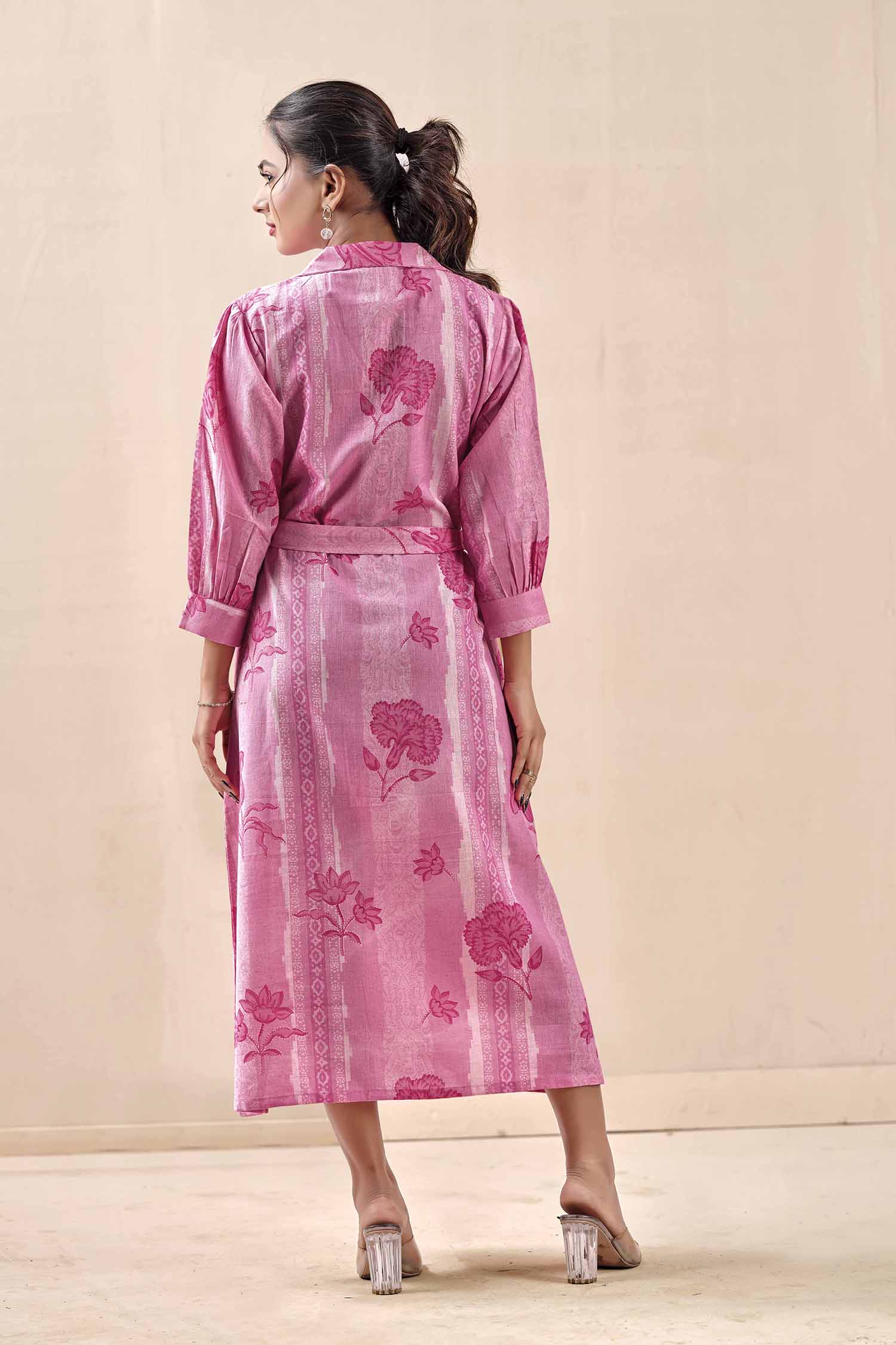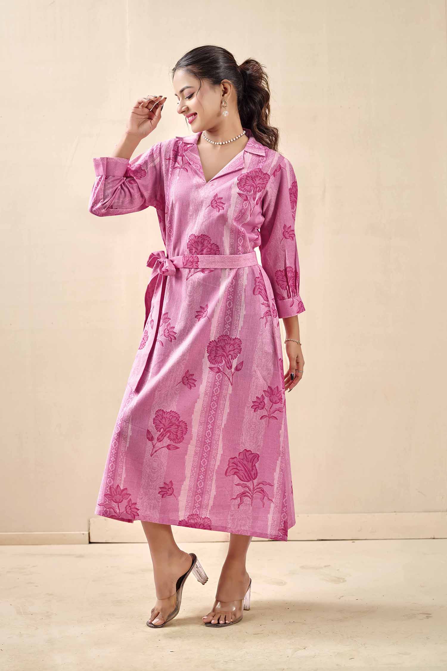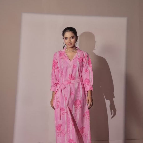 Elevate your everyday elegance with our Blush Petal & Stripe Notched Collar Midi Dress. This piece beautifully blends classic tailoring with a feminine flair, featuring a unique vertical stripe and floral motif print in shades of magenta and blush. Expertly crafted from natural Khadi cotton, this dress is celebrated for its rich, artisanal texture and exceptional breathability. The notched lapel collar and gathered three-quarter sleeves provide a smart, polished look, while the adjustable waist tie allows you to define your silhouette for a perfect fit. Whether for brunch dates, office wear, or an afternoon out, this dress is a testament to sustainable style and effortless comfort.