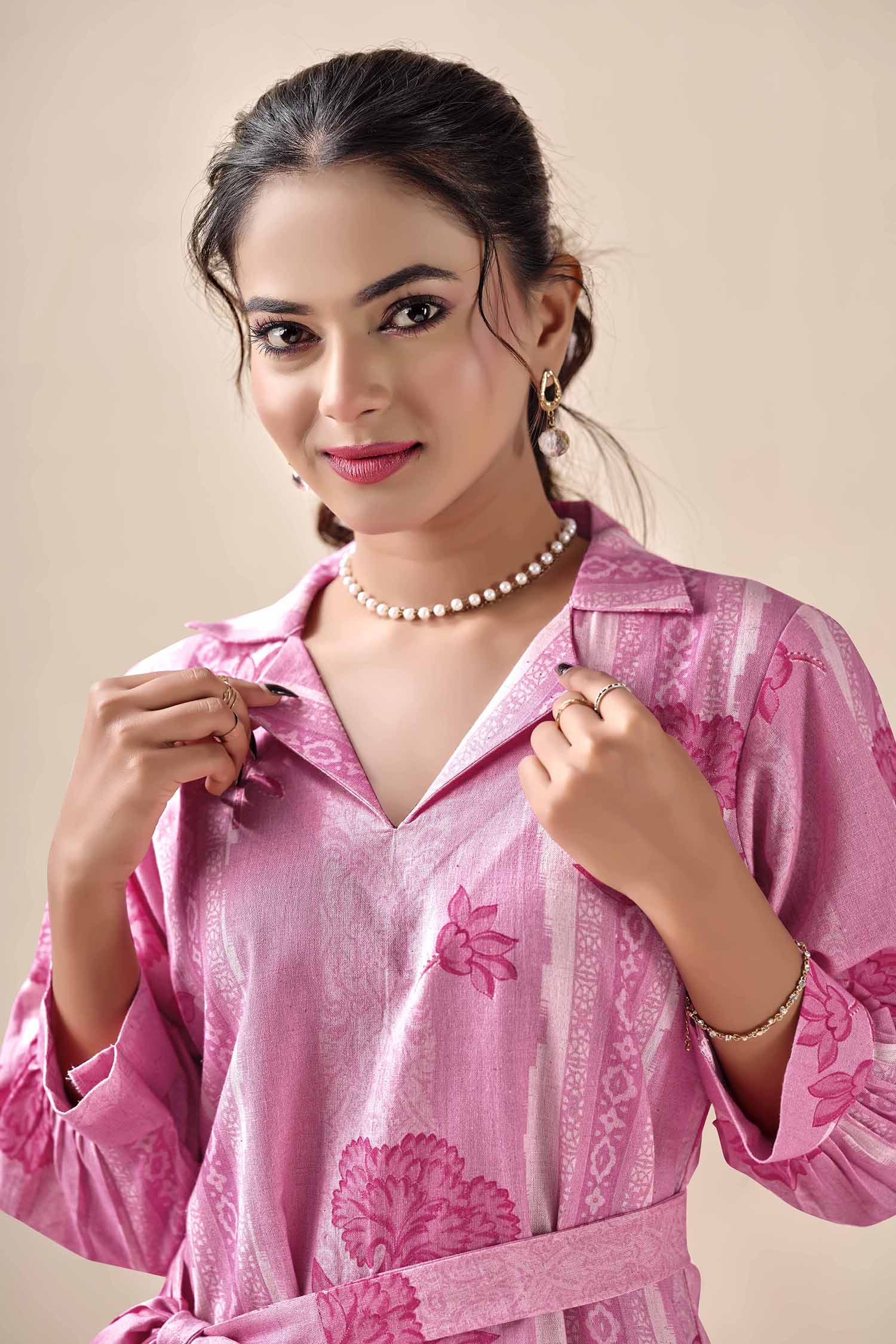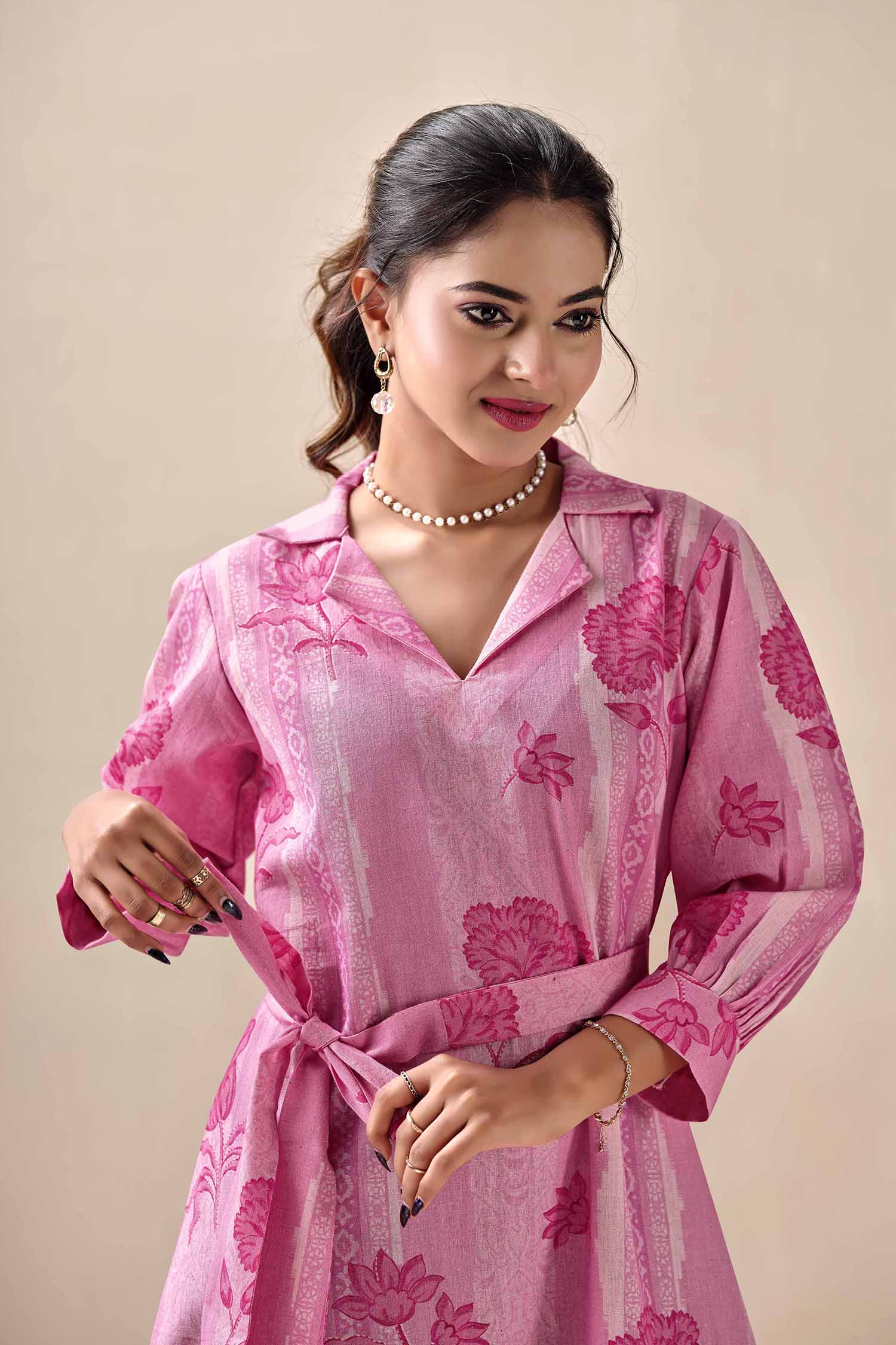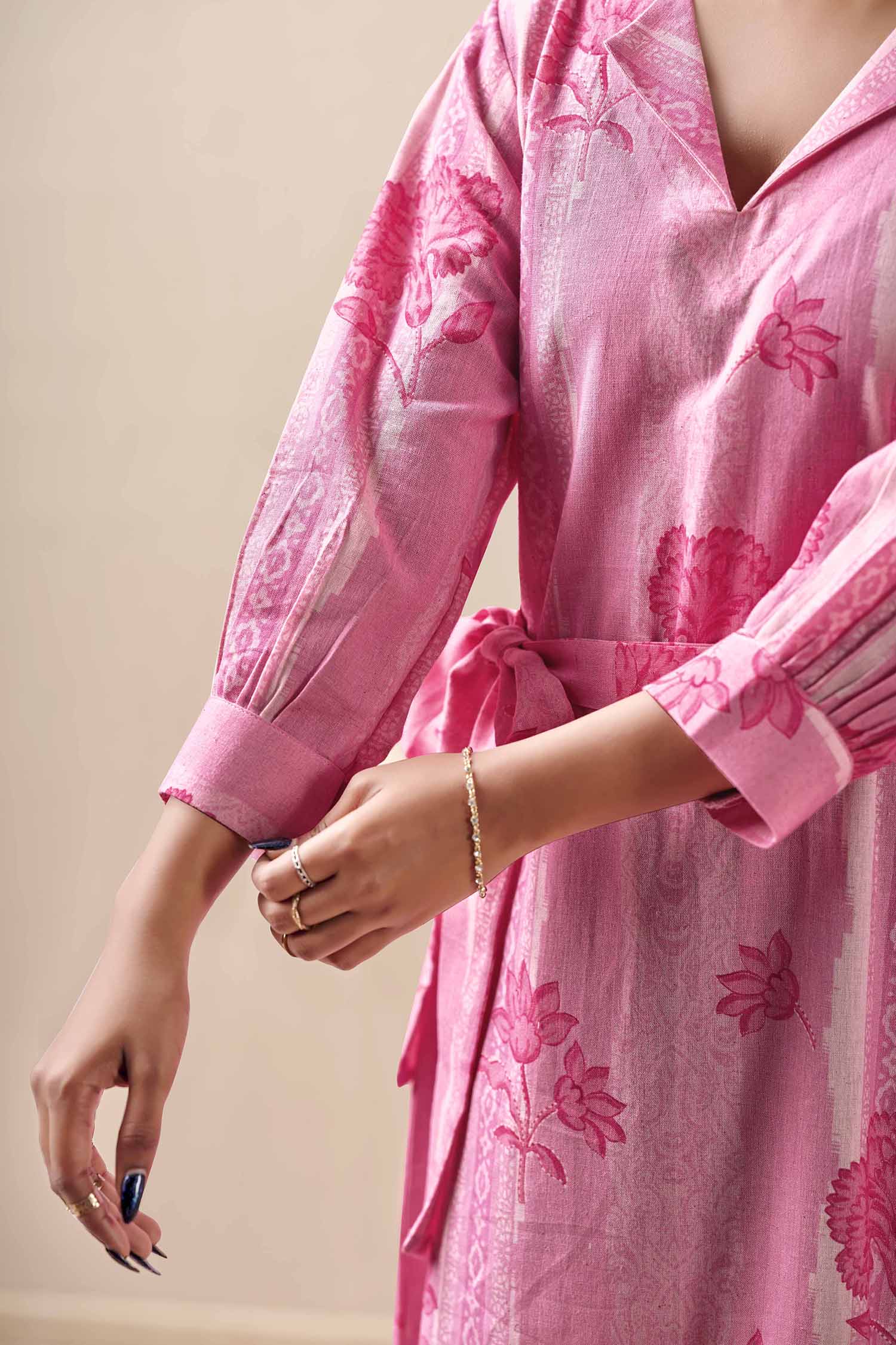 Elevate your everyday elegance with our Blush Petal & Stripe Notched Collar Midi Dress. This piece beautifully blends classic tailoring with a feminine flair, featuring a unique vertical stripe and floral motif print in shades of magenta and blush. Expertly crafted from natural Khadi cotton, this dress is celebrated for its rich, artisanal texture and exceptional breathability. The notched lapel collar and gathered three-quarter sleeves provide a smart, polished look, while the adjustable waist tie allows you to define your silhouette for a perfect fit. Whether for brunch dates, office wear, or an afternoon out, this dress is a testament to sustainable style and effortless comfort.