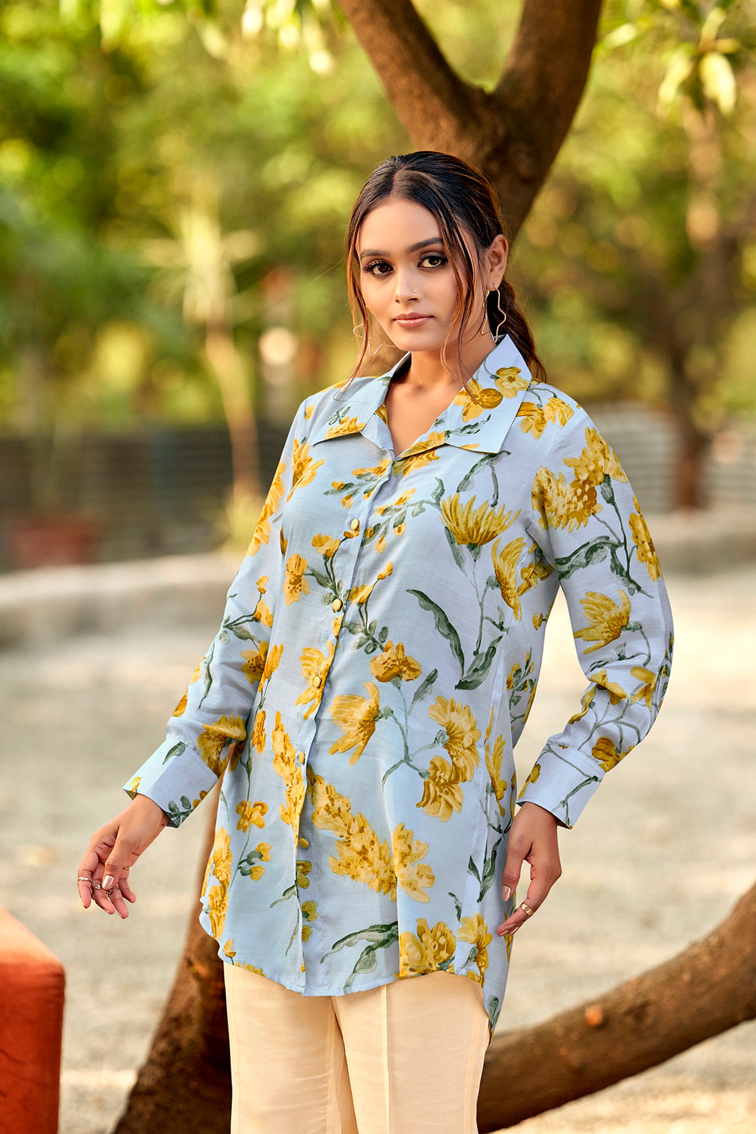 Step out with confidence and timeless elegance in our Celestial Blue Bloom Shirt. Crafted from soft, luxurious, natural cotton silk, it features delicate floral prints on a soothing celestial blue base. Lightweight, breathable, and smooth to the touch, this shirt is perfect for office wear, brunches, casual outings, small gatherings, and meet-ups. Its rich texture ensures all-day comfort while keeping your look graceful, refined, and effortlessly stylish.