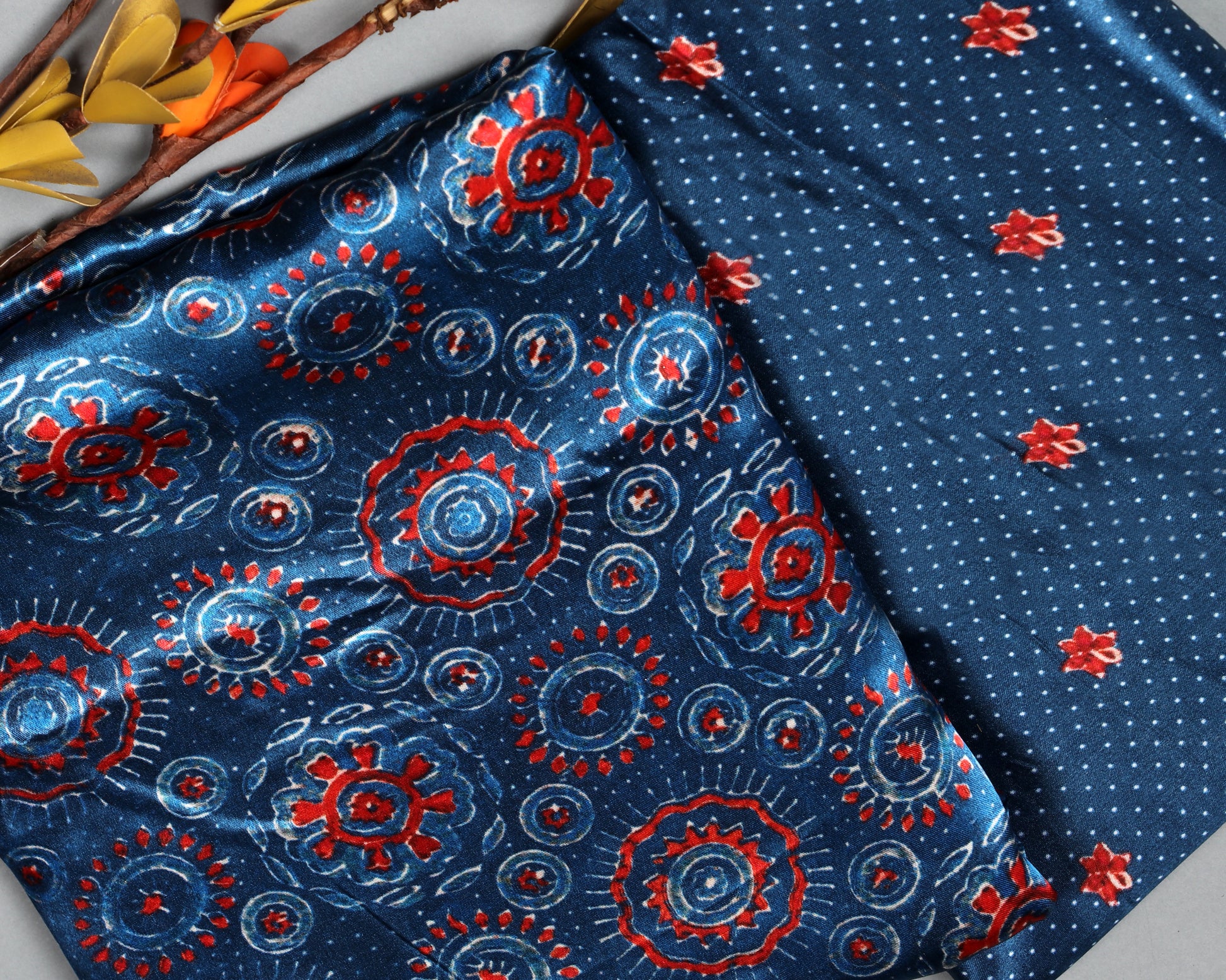 This Gajji Silk Fabric is digitally printed with a Ajrakh design. It is ideal for a party or get together. It can be styled as a Tunic dress or the trendy Co-ord set for the Festive season on its way. Gajji Silk has a satin finish done on silk fabric. It has a smooth, glossy, and rich texture.
