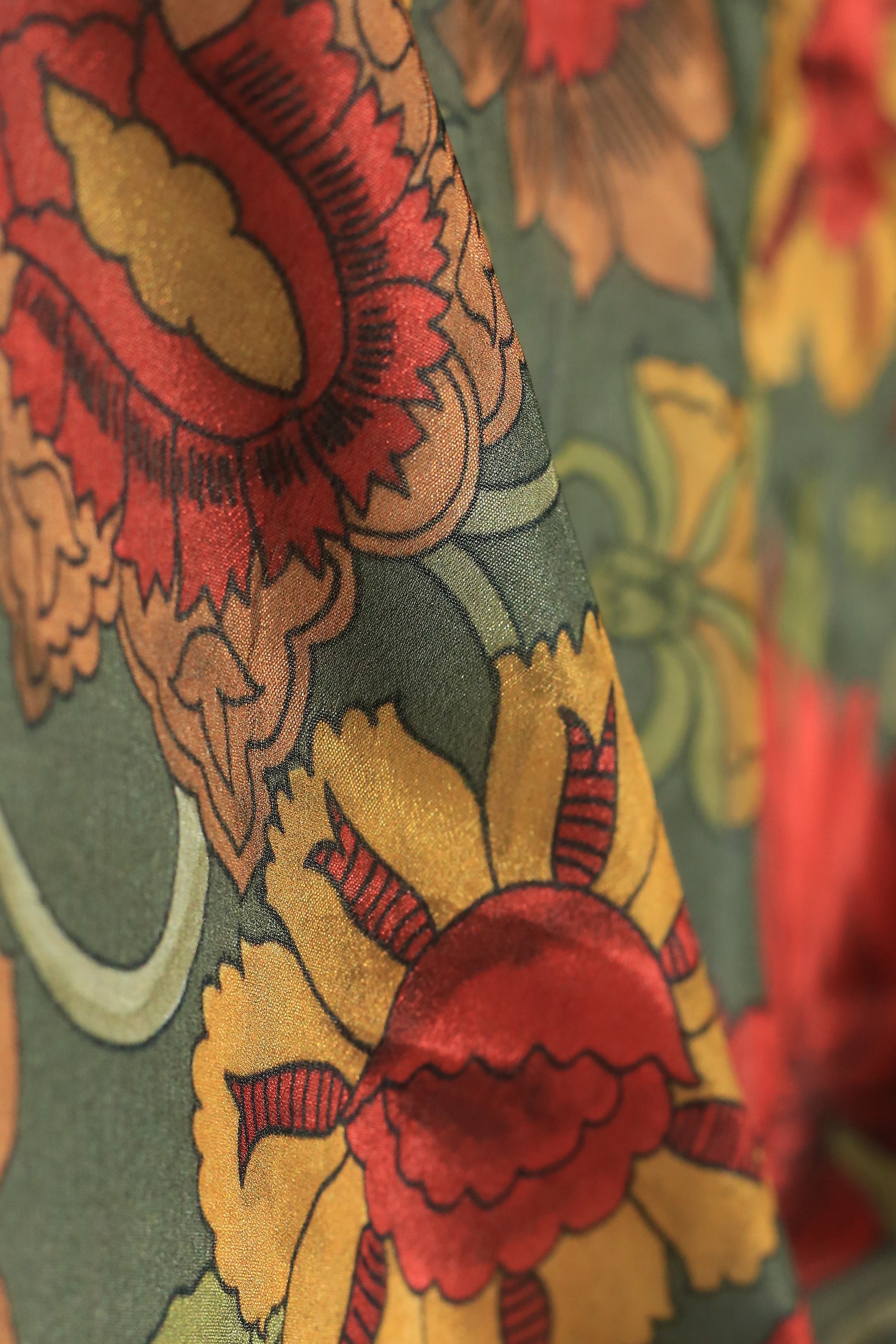 This Chinon fabric is digitally printed with a floral design. It is ideal for Comfort wear. It can be styled as a tiered Dress, a kaftan. Chinon fabric is a variation of Chiffon fabric. It has more sheen than Chiffon fabric. It has a wonderful feel and fall. It is a sheer, lightweight fabric.