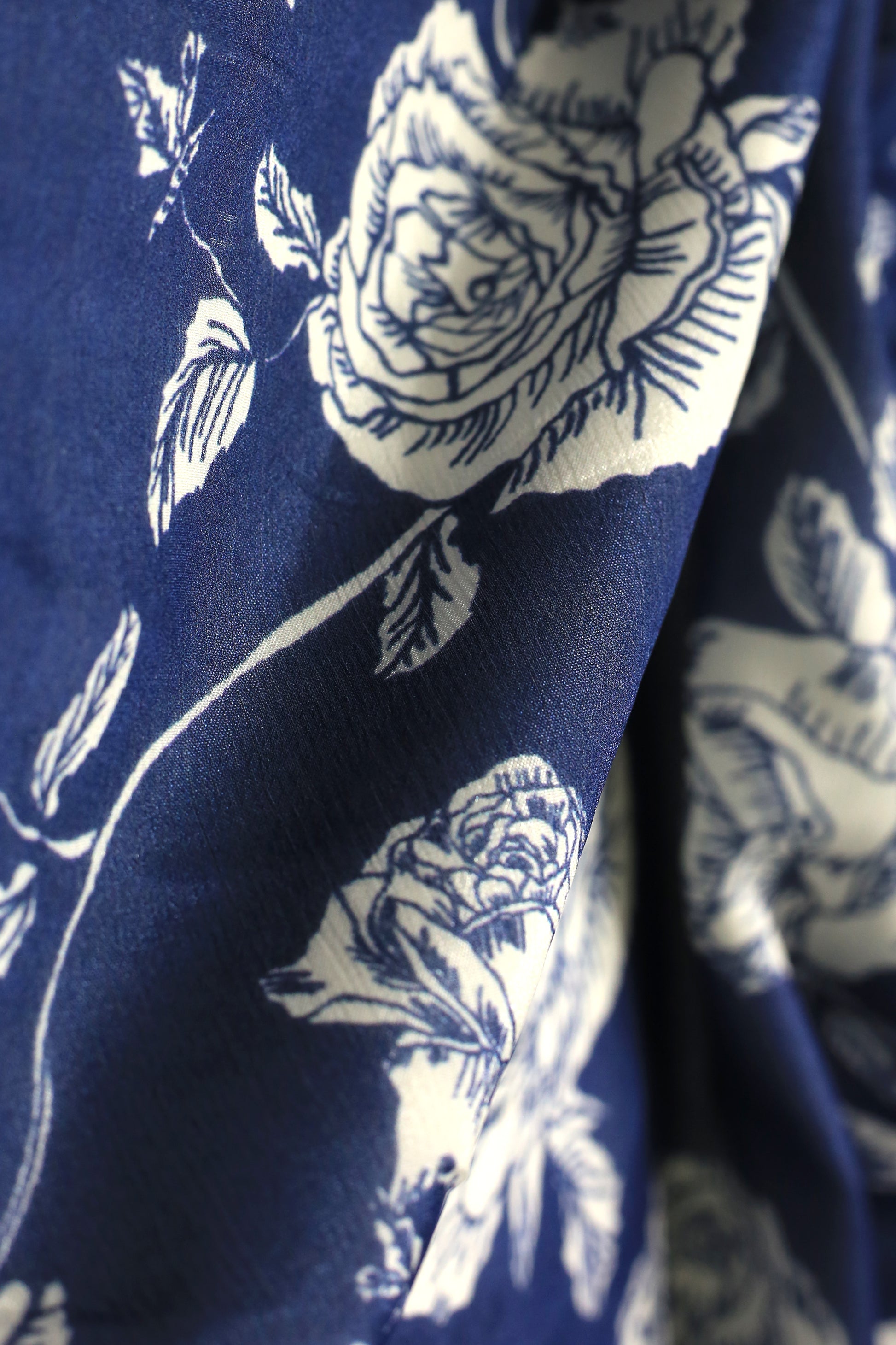 This Chinon fabric is Digital printed with Floral design. It is ideal for Festive wear. It can be styled as a tiered Dress, Kaftan or a Saree. Chinon fabric is a variation of Chiffon fabric. It has more sheen than Chiffon fabric. It has a wonderful feel and fall. It is sheer, light weight fabric.
