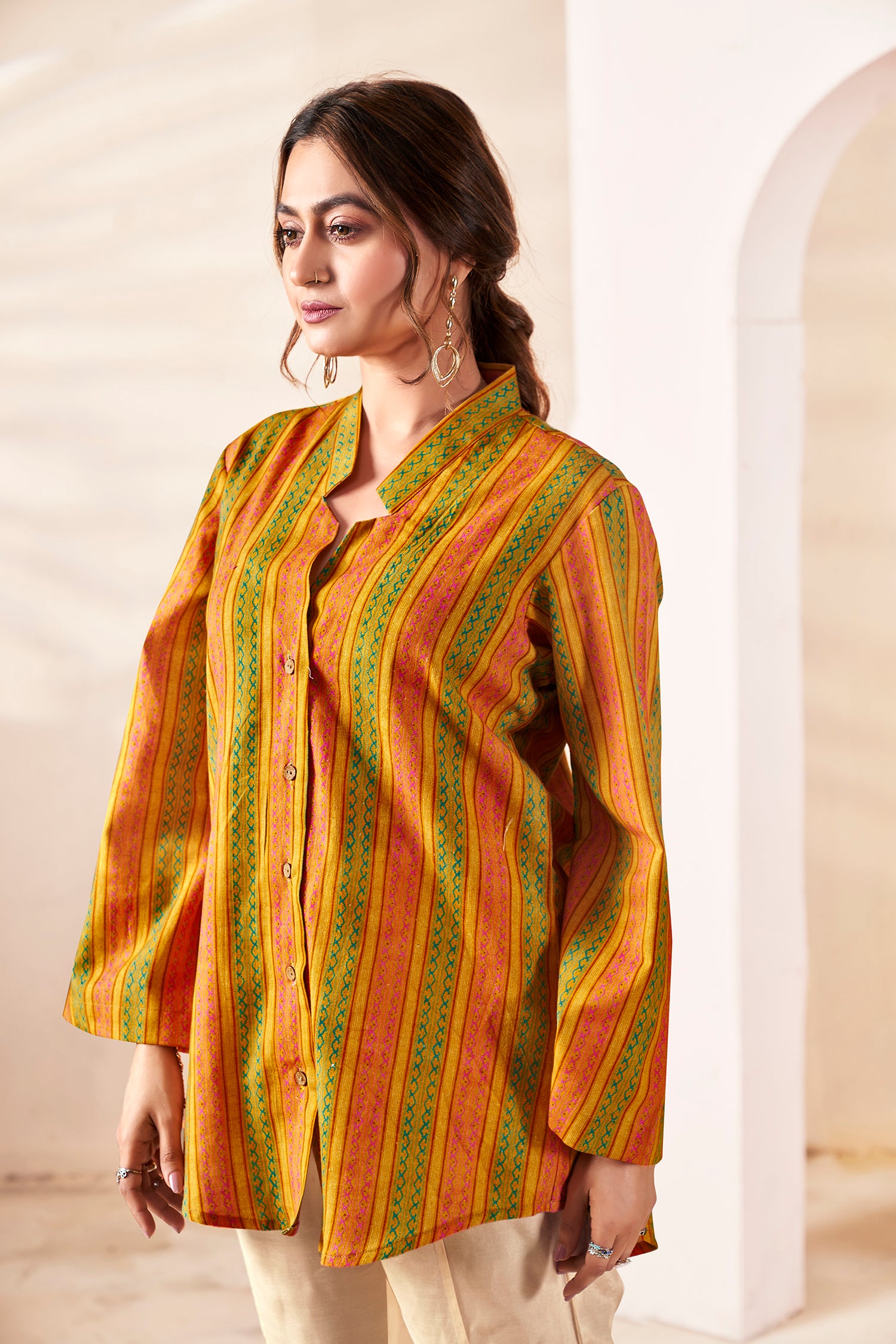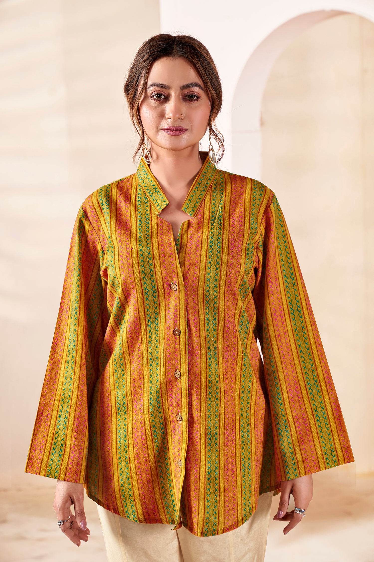 Celebrate the fusion of traditional craftsmanship and modern silhouettes with this exquisite handloom shirt, designed for the woman who values both heritage and high fashion. Featuring a warm, soft pastel palette with intricate vertical patterns , providing a professional look that radiates quiet confidence. Transition effortlessly to a brunch or friends' outing and transitions seamlessly into chic gatherings or outings sophisticated mandarin collar . Whether you are staying effortlessly cool during friends' outings or enjoying the premium comfort of its high-quality, breathable fabric , this relaxed-fit Shirt ensures all-day ease. Its authentic multi-tonal stripes , curved hem, and Bell sleeves create a flattering, contemporary drape that makes it a versatile staple for any wardrobe.