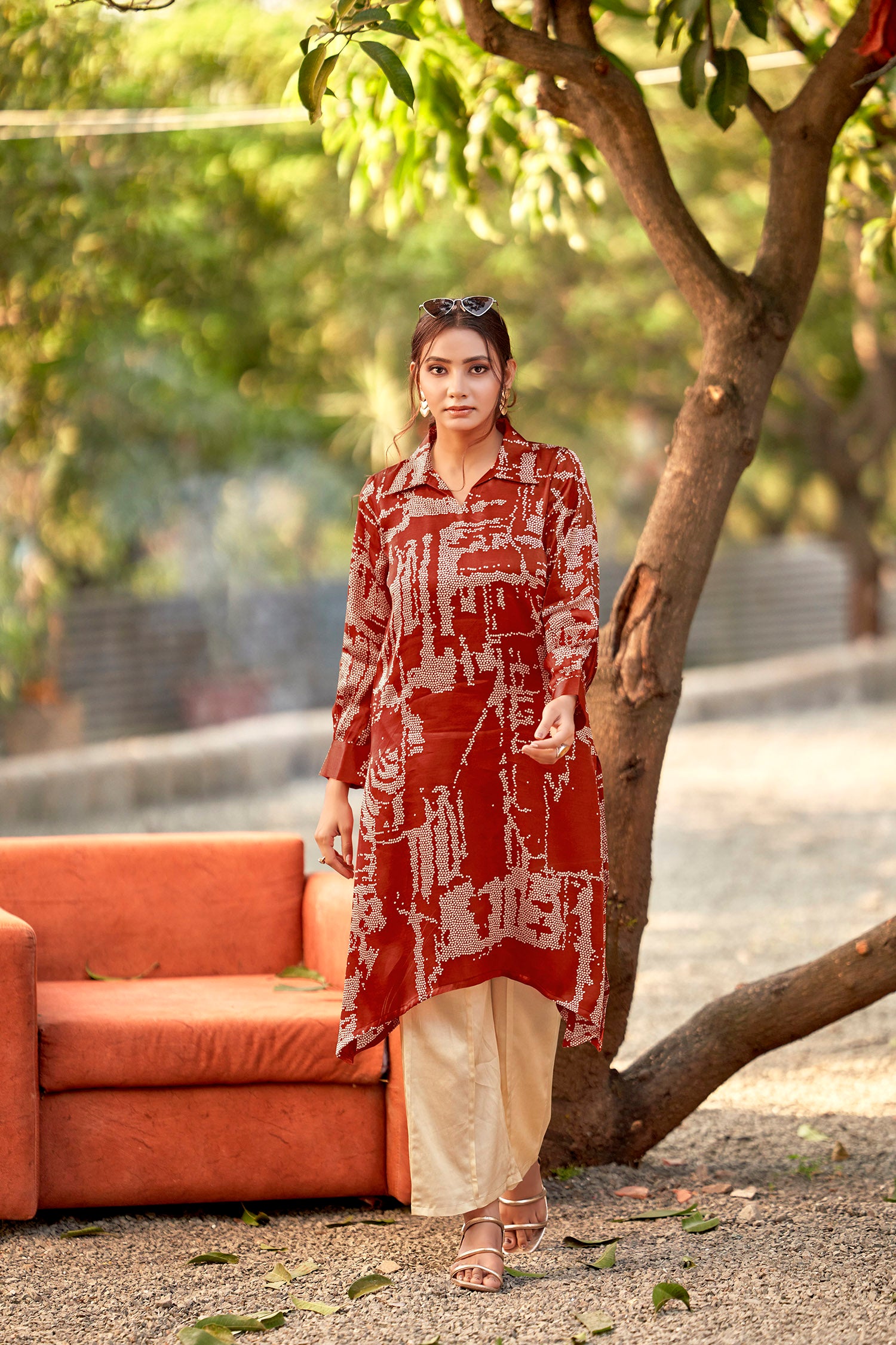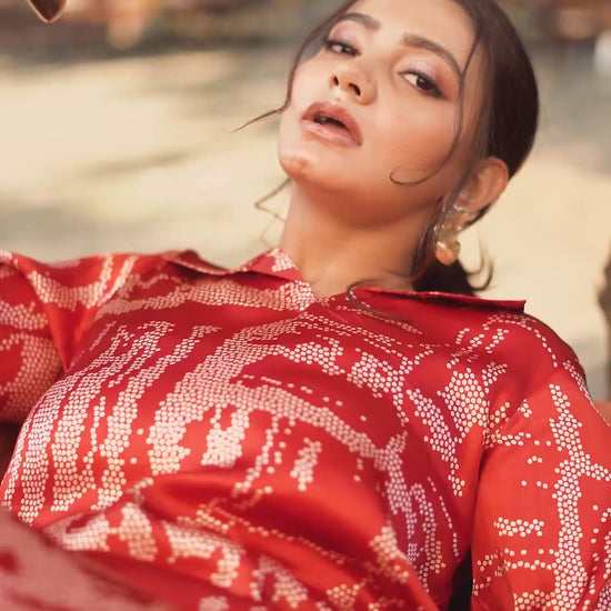 Gracefully blending heritage with modern refinement, the Rust Bandhej Lustrous Silk Kurta is crafted from rich, lustrous gajji silk that offers a soft sheen and an elegant drape. The abstract bandhej-inspired print adds depth and character to the warm rust hue, creating a look that feels artisanal yet contemporary. Designed with a structured collared neckline, full sleeves, and a clean straight silhouette finished with an asymmetric hem, this kurta is ideal for refined daywear, cultural gatherings, or elevated everyday styling.